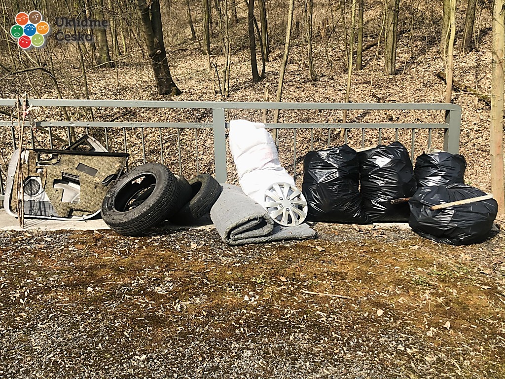 Od místa potkání úklid lesem a kolem silnice Pisárecká. 3 pytle + pneumatika, dveře od auta a cca 15 kg železa.