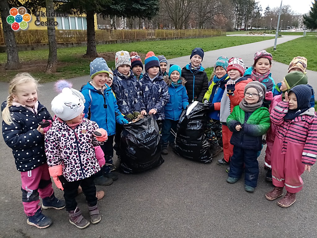 25 dětí a 2 učitelky z Montessori třídy (Fialové klubíčko) sesbírají odpadky v okolí školky a v místech přilehlého okolí, kam si chodí hrát (lezecí stromy, naše trasa v okolí Labe).